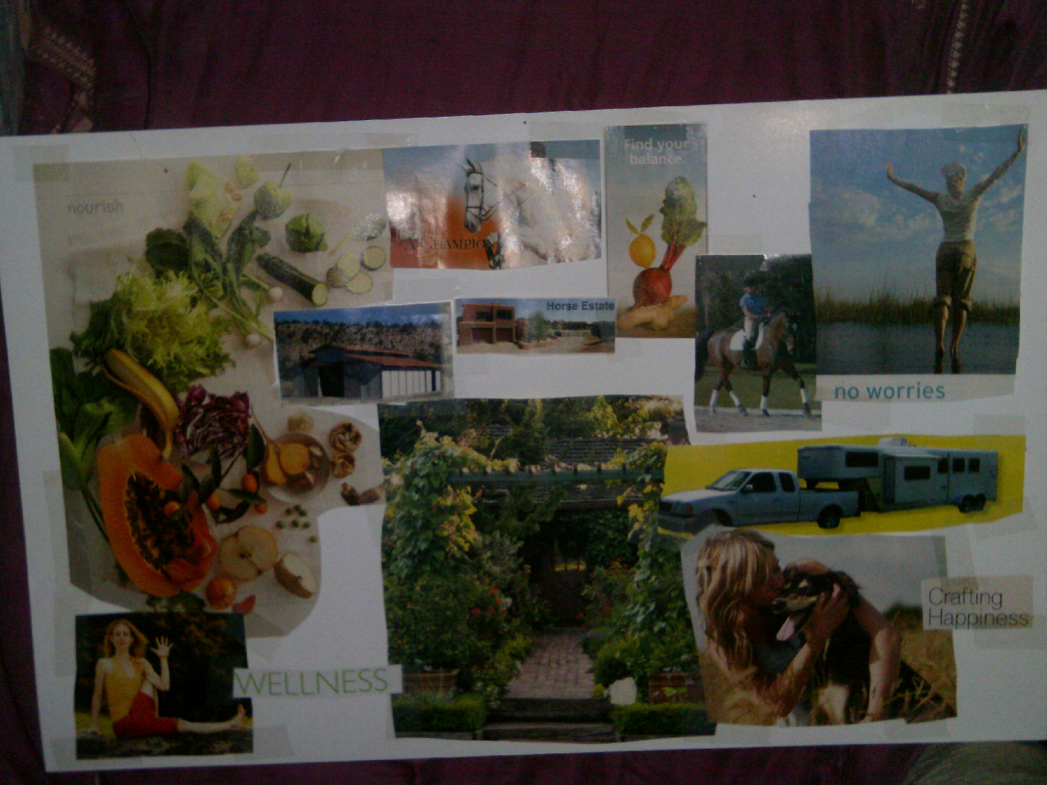 I just did that tonight. In my closet was one from 4 or 5 years ago when I was renting, trying to care for my horses and build the foundation for a new business while, personally, I was crashing inside. My skin was peeling off of my legs from stress, I was heavy, weak, depressed and scattered. This vision board expressed the health and peace of mind I desired. It showed the desire for a home, a barn and a horse trailer. A full fridge (full of fresh, healthy, organic foods), gardens… my soul was craving all of this.