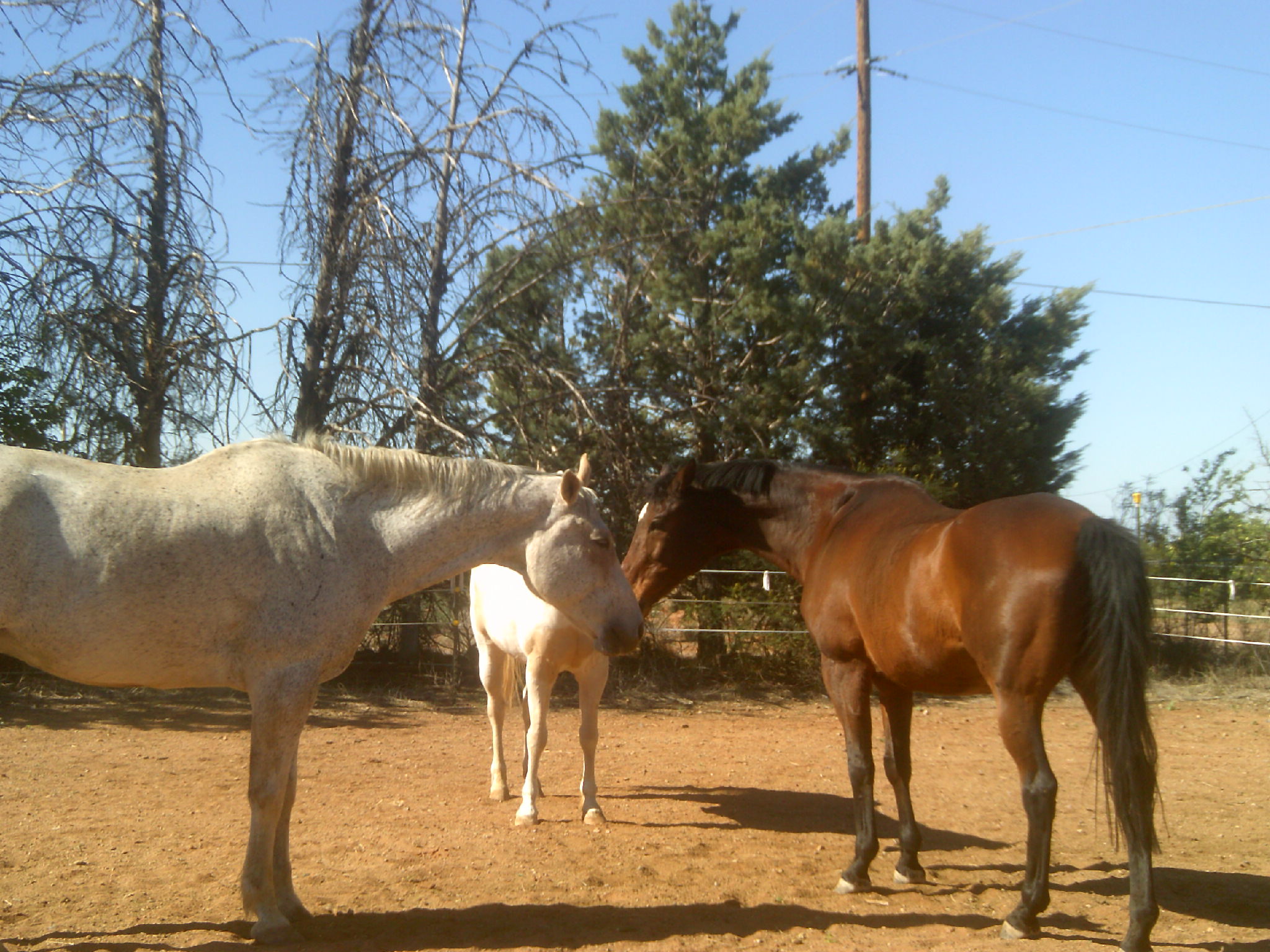 So, I walk around the stable yard with the spray bottle, treating each horse, every couple of hours. The new horse, Vega, stomps his front feet because of the flies (all 3 of them right now!) and he has his knee a little filled from the concussion – you guessed it, comfrey!