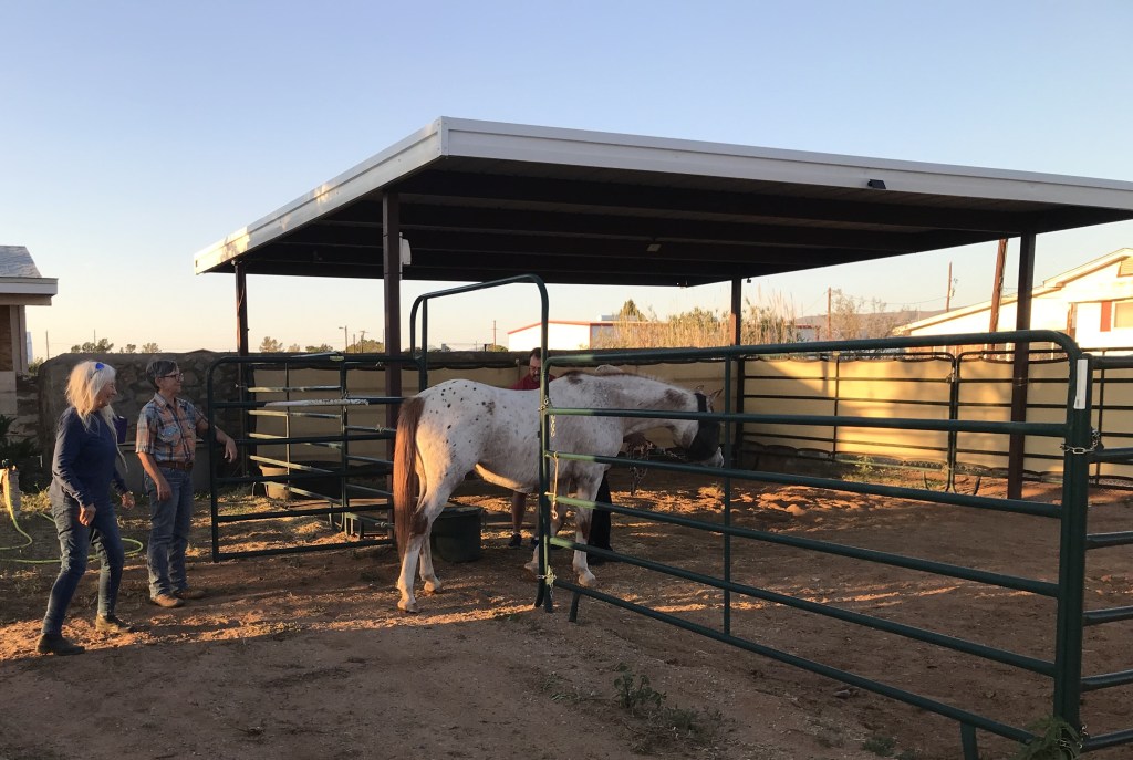 What a lesson we have had in the workings of Universal wisdom, applied for the wellbeing of our equines. As I write this, it has been one week since my friend and I drove across New Mexico and picked up a new intake from up north. This mare, Sugar, had been with her family for over a decade. Over time, Sugar had lost her sight in one eye; then became blind in the other. She had a bonded pony up until he passed over last year. As Sugar lost her eyesight, her people had attached a bell to her pony’s (breakaway) halter. When I got the call about taking her into Sanctuary, she fit the criteria. Her family was moving overseas and, even if they could take her, such a trip would not have been fair to her. She’s an elder.