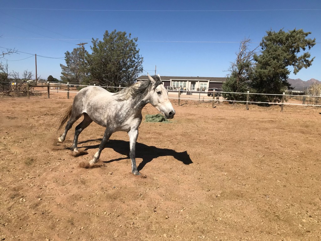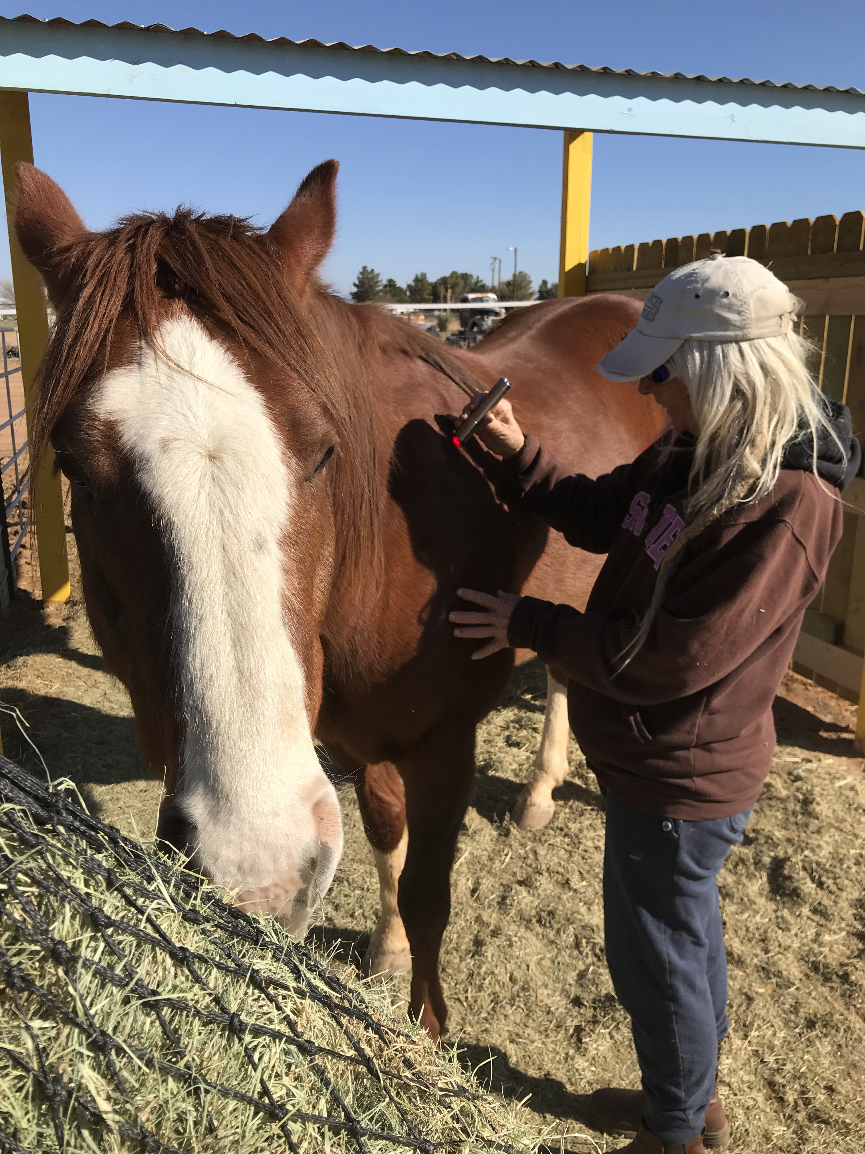 What a lesson we have had in the workings of Universal wisdom, applied for the wellbeing of our equines. As I write this, it has been one week since my friend and I drove across New Mexico and picked up a new intake from up north. This mare, Sugar, had been with her family for over a decade. Over time, Sugar had lost her sight in one eye; then became blind in the other. She had a bonded pony up until he passed over last year. As Sugar lost her eyesight, her people had attached a bell to her pony’s (breakaway) halter. When I got the call about taking her into Sanctuary, she fit the criteria. Her family was moving overseas and, even if they could take her, such a trip would not have been fair to her. She’s an elder.