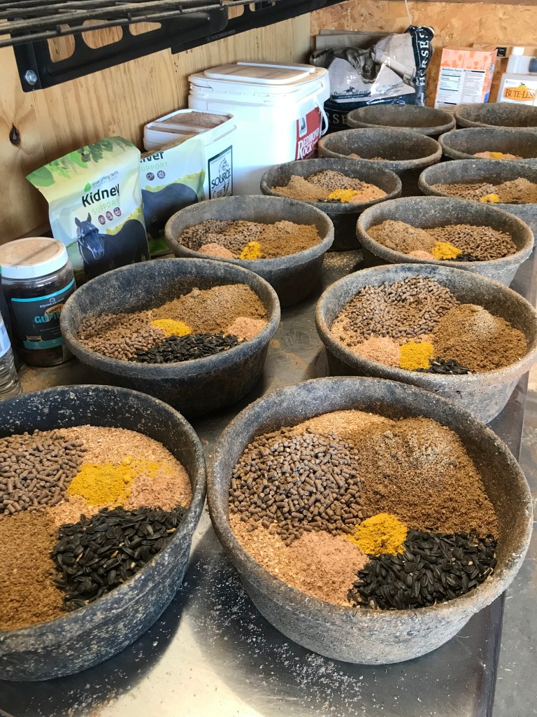 Individual horses get herbs (uva ursi for renal system, cleavers for the gray horses and Appaloosas, etc.) and nutraceuticals for their specific needs. It really is the best way for us to maintain their health!