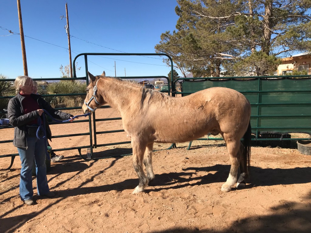 We rarely know anything about the background on a new horse or mule. Often an estray has been dumped in the desert and if they were once loved, they feel betrayed and confused. All we can do is make them comfortable and start from scratch, making this their home. If we know details from their past, we use that information to make changes gradually.